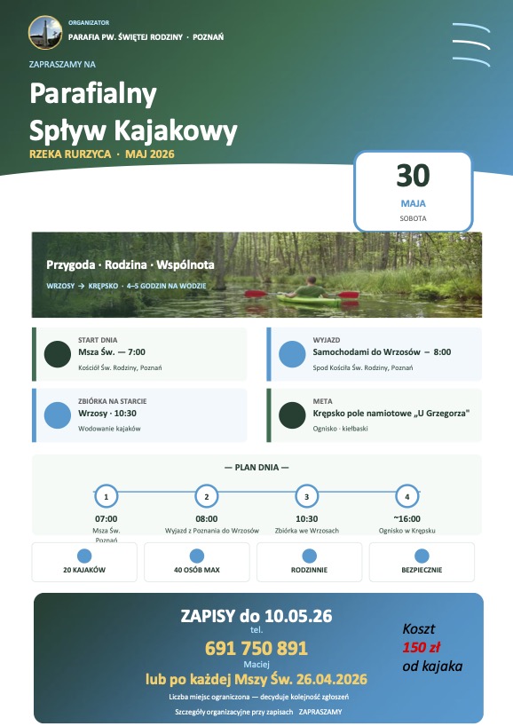 - Organizujemy parafialny spływ kajakowy, który odbędzie się 30 maja 2026r. Płynąć będziemy rzeką Rurzycą, odcinkiem Wrzosy- Krępsko. Dokładne informacje znajdują się na plakatach w gablotach. W przyszłą niedzielę (26.04) w czasie każdej Mszy Świętej organizatorzy zachęcą nas do tego wydarzenia osobiście.